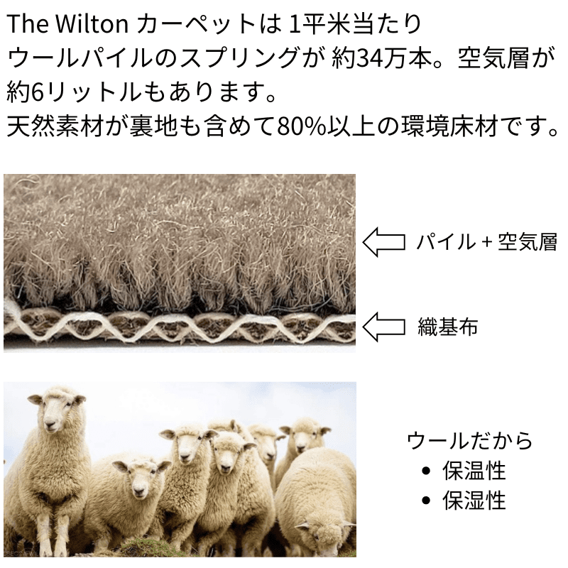 ウールは自然に断熱効果があり 家の温度を快適に保ち 寒い季節には暖かく 暖かい季節には涼しく保ちます。また ウールはパイル糸の表面が少しずつ剥がれていきますので 毎日新しい状態です。